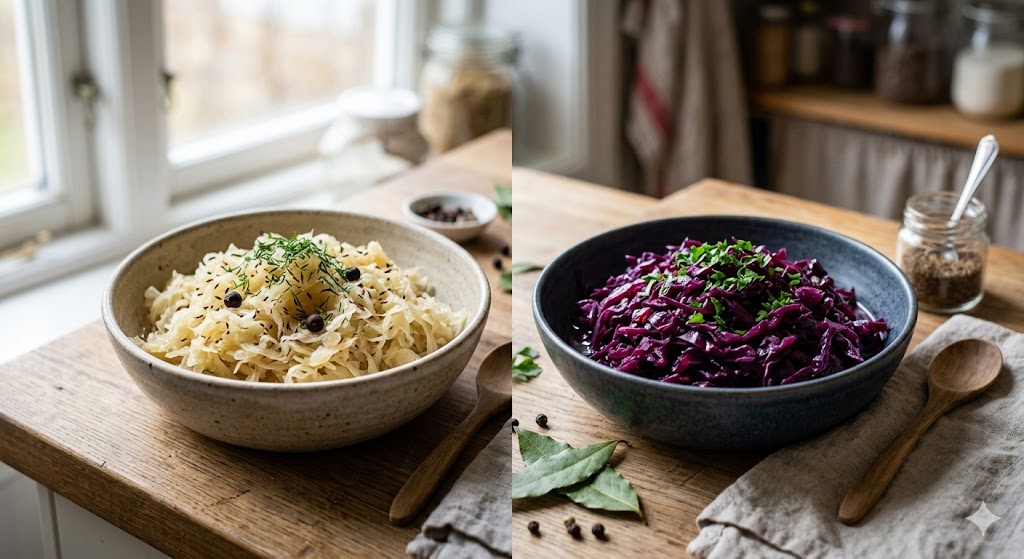 Hjemmelaget surkål og rødkål er essensielt for å balansere den fete julematen. Den syrlige smaken fra eddik og sødmen fra epler og sukker renser ganen mellom hver bit av ribben. Mange velger å kjøpe ferdige poser, men det er overraskende enkelt å lage selv, og smaken blir ofte langt dypere og mer kompleks. Ved å tilsette litt av ribbefettet i kålen mot slutten av koketiden, får du den autentiske smaken som knytter hele måltidet sammen.