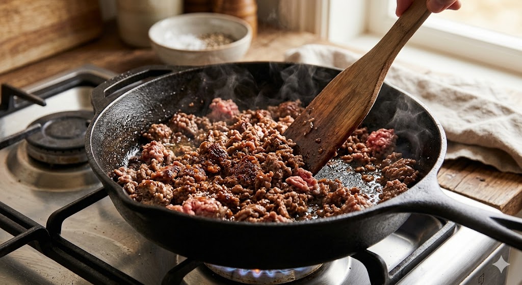 Hvorfor skiller det ut vann når jeg steker deigen? Dette skjer hvis pannen er for kald eller du har for mye kjøtt i pannen samtidig, slik at det koker i stedet for å steke.